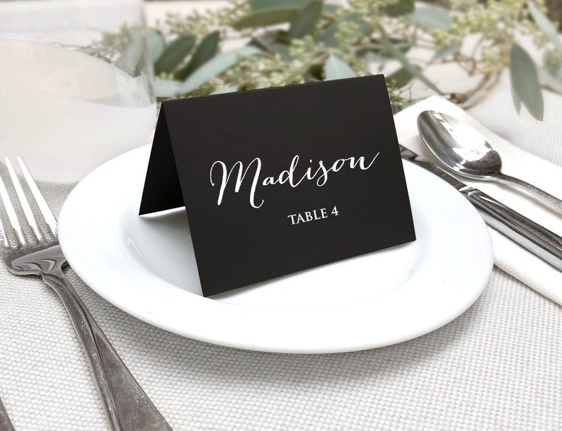 These printed Black and White Place Cards are gorgeous. Your guest's names along with their table assignments will pop with elegance on these simple, modern, and crisp looking wedding name cards. This black card stock will compliment any wedding or special celebration perfectly. With new modern white printing these cards will stand out with style.