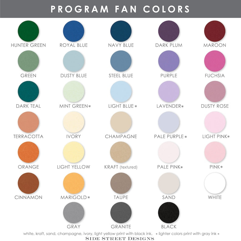 Each 5" x 7" program fan with rounded corners is printed on your choice of colored card stock, choose from over 14 on-trend wedding colors! Colors are shown in the drop down box while checking out.