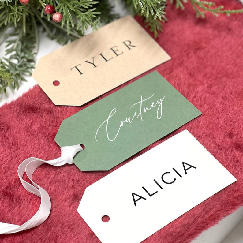 These customized Christmas name tags are perfect for stocking tags, Christmas dinner place cards, holiday favor bags, or for adding a personal touch to all your Christmas gifts.