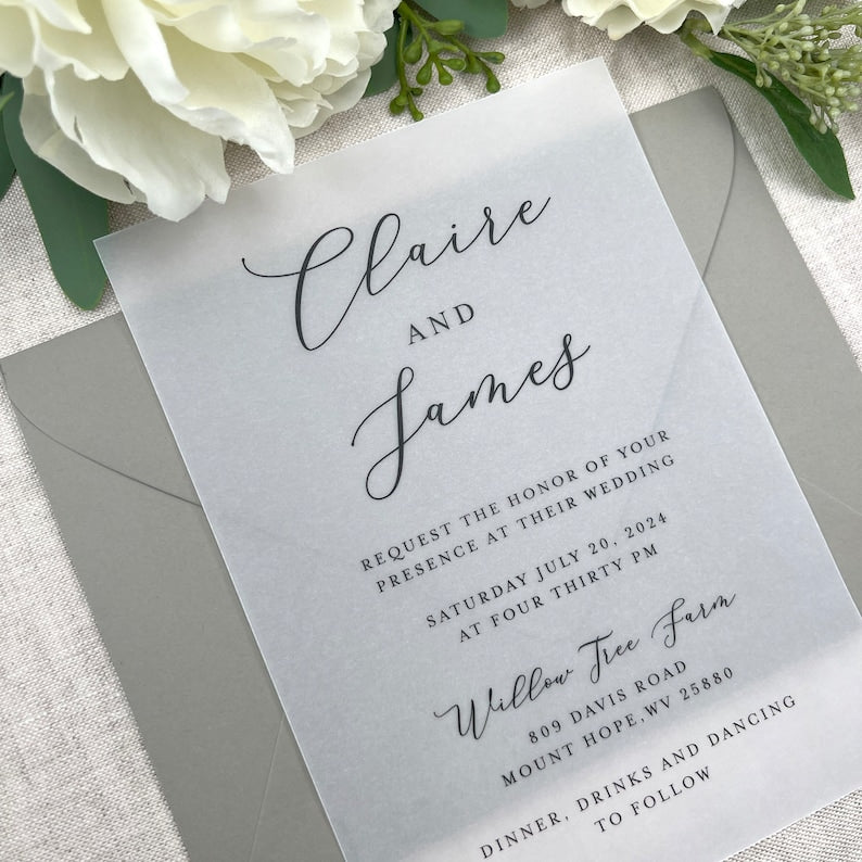 Classic and Clean, these beautifully printed vellum invitations can be printed with white or black ink for a classic and romantic look. No need to stress with digital downloads, we design, print, and ship these vellum invites directly to you. We customized these printed vellum invitations with whatever text you send us, just enter all your information into the personalization box at checkout. These can really be customized for any event whether it is for your Wedding, Rehearsal Dinner, special Birthday event or Baby Shower. Choose your ink color and if you want a vertical layout ( shown in item listing ), or a horizontal layout for your vellum printed wedding invitations.