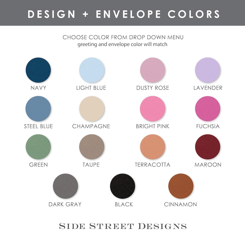 Matching all the wedding details! These Bridesmaid cards are a new addition to the Side Street Designs wedding card collection. Simply stated in a variety of colors, write your sweet sentiments to your very important people on the inside of these folded cards. Choose your color for your outside greeting with matching colored envelopes.