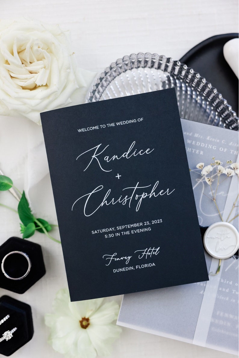 With modern white ink printing on bold and rich colored card stock this simple look will wow your wedding guests while you are walking down the aisle.