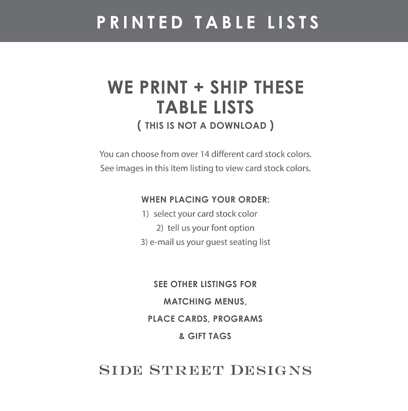 Each 5" x 7" printed table list is printed on the card stock color of your choice, choose from over 14 on-trend wedding colors! Colors are shown in the drop down box while checking out.