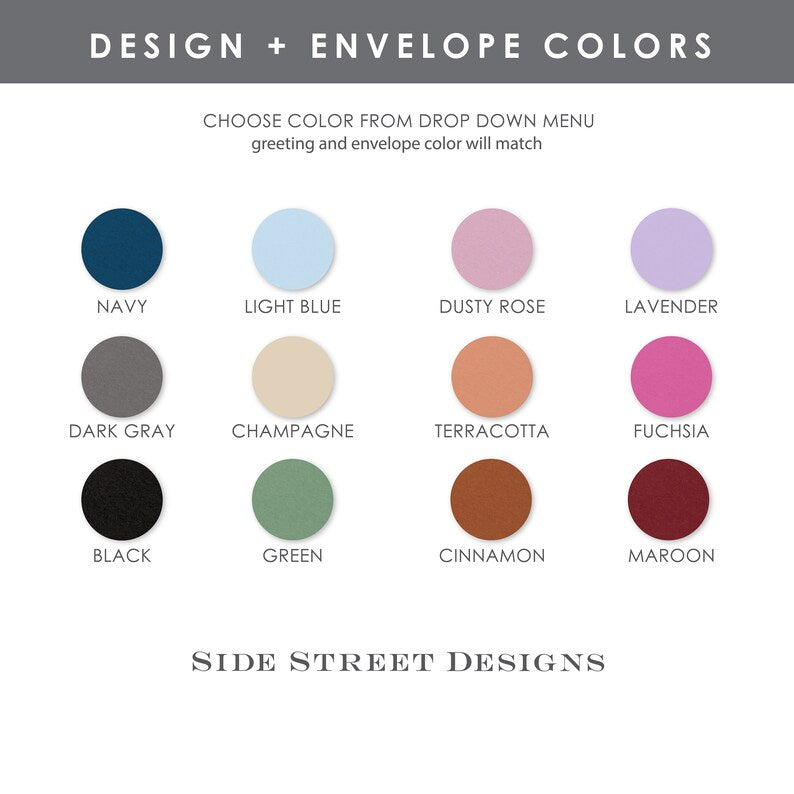 Matching all the wedding details! These Bridesmaid cards are a new addition to the Side Street Designs wedding card collection. Simply stated in a variety of colors, write your sweet sentiments to your very important people on the inside of these folded cards. Choose your color for your outside greeting with matching colored envelopes.