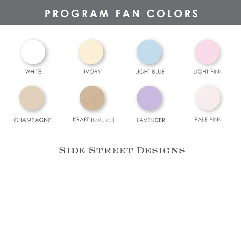Each 5" x 7" program fan with rounded corners is printed on Eco-friendly 100% recycled card stock, and includes wooden sticks. Choose from different card stock colors in the drop down menu.