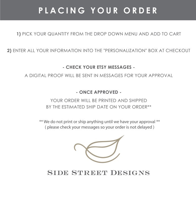 These Wedding Menus are stunning. This new modern, simple, and clean menu design will go with any wedding decor. You can choose from many different card stock colors to coordinate with your wedding table scapes, see colors in drop down menu. Accenting your reception table settings with just a simple pop of color has never been easier. All our fine stationery is printed in house. These printed menus are durable and sturdy.